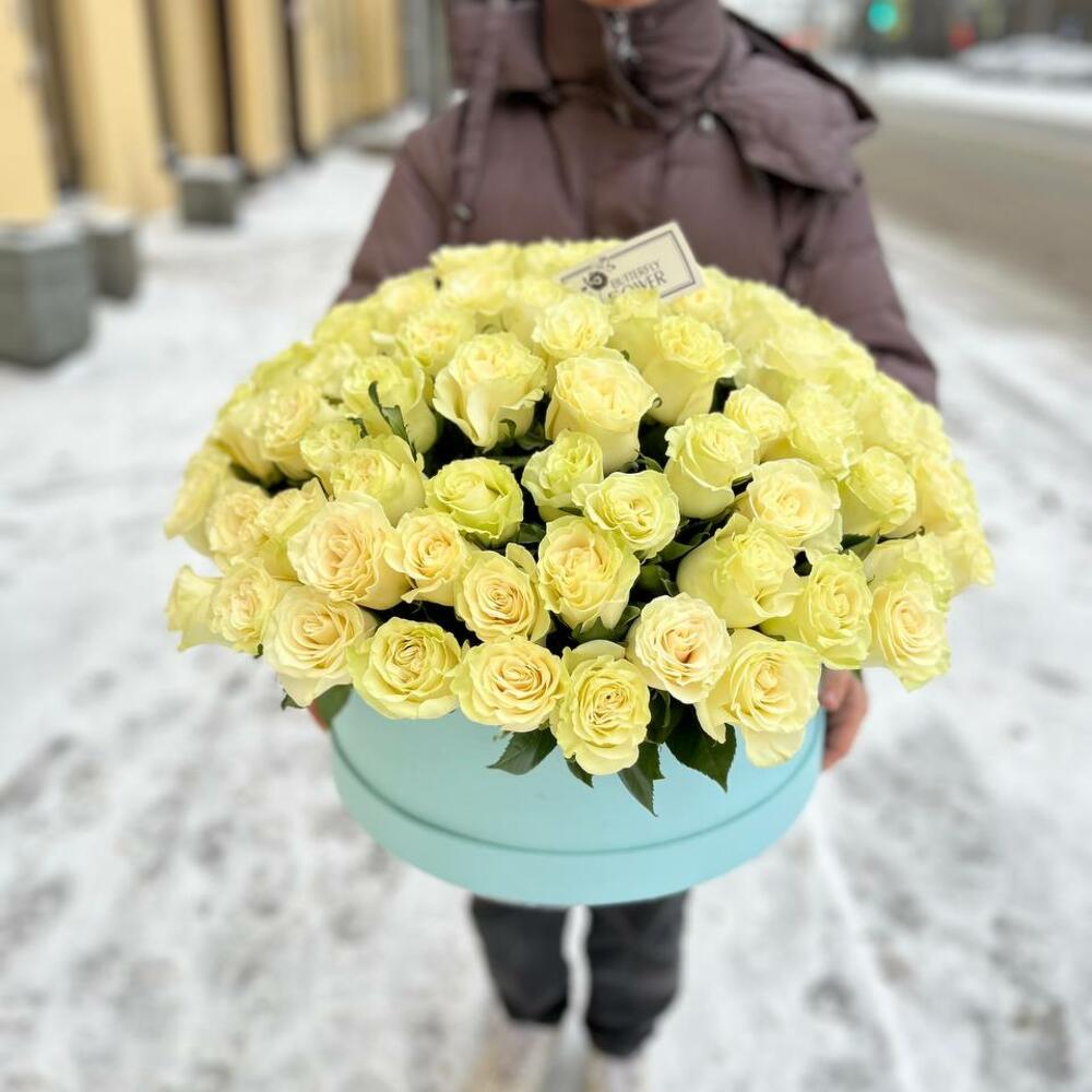 Большой букет из 101 белой розы в шляпной коробке “101 снежинка”