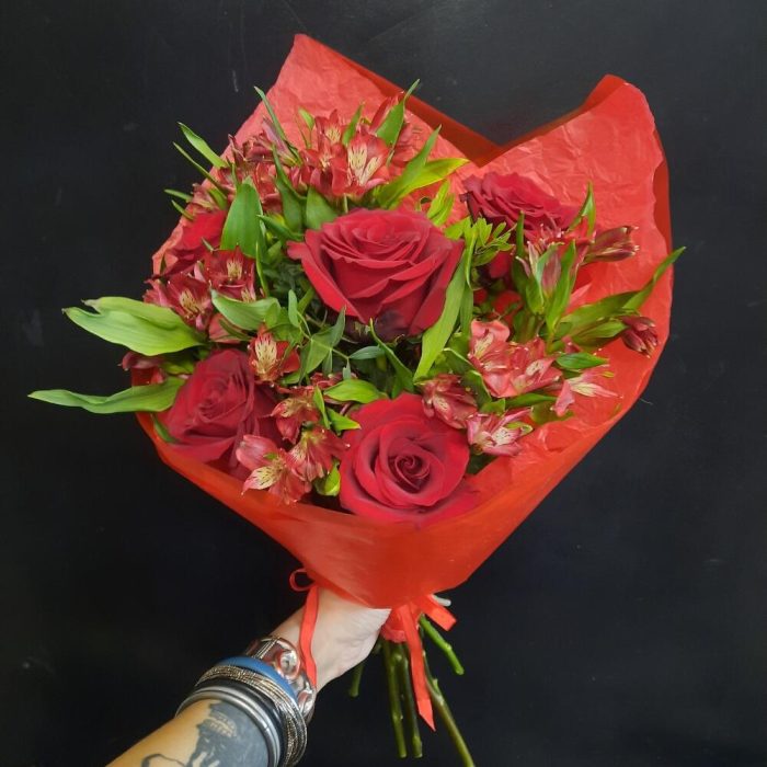 Роза Эквадор 60 см – 5 шт.Альстромерия – 7 шт.Фисташка – 3 шт.Тишью – 1 шт.Калька упаковка – 1 шт.Лента атласная – 2 шт.