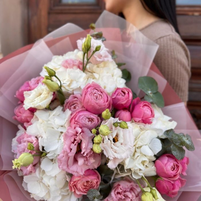 Гортензия – 3 шт.Эвкалипт – 3 шт.Лента атласная – 2 шт.Пленка матовая – 6 шт.эустома махровая розовая – 2 шт.роза пионовидная сильва пинк – 5 шт.