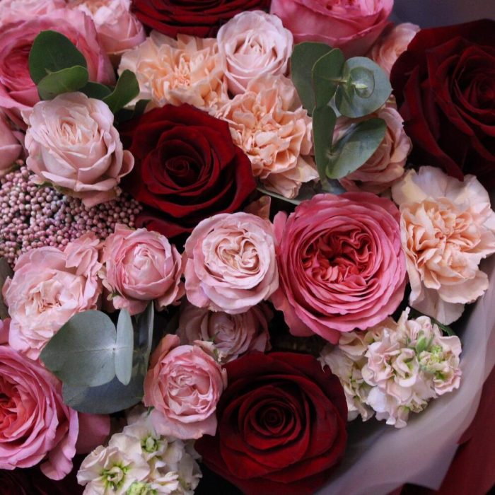 Роза Эксплорер – 7 шт.роза пионовидная пинк экспрешн – 6 шт.Озотамнус – 1 шт.Диантус – 5 шт.Роза кустовая пионовидная мадам бомбастик – 5 шт.Маттиола – 3 шт.Эвкалипт – 2 шт.Пленка дизайнерская – 3 шт.Лента атласная – 1 шт.