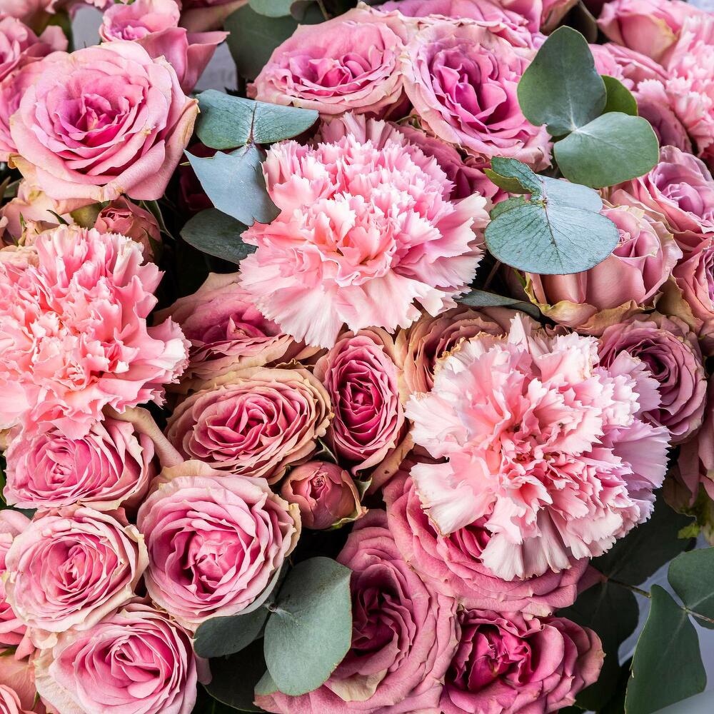 Роза кустовая пионовидная – 15 шт.Диантус сортовой – 6 шт.Эвкалипт – 1 шт.Подарочная упаковка – 1 шт.средство для продления жизни срезанных цветов – 1 шт.