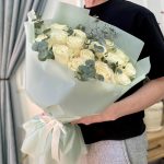 Букет белых пионовидных роз с эвкалиптом – «15 почему я тебя люблю»