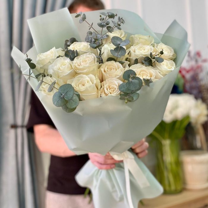роза белая плайя бланка – 15 шт.эвкалипт 100 – 4 шт.Пленка дизайнерская – 4 шт.