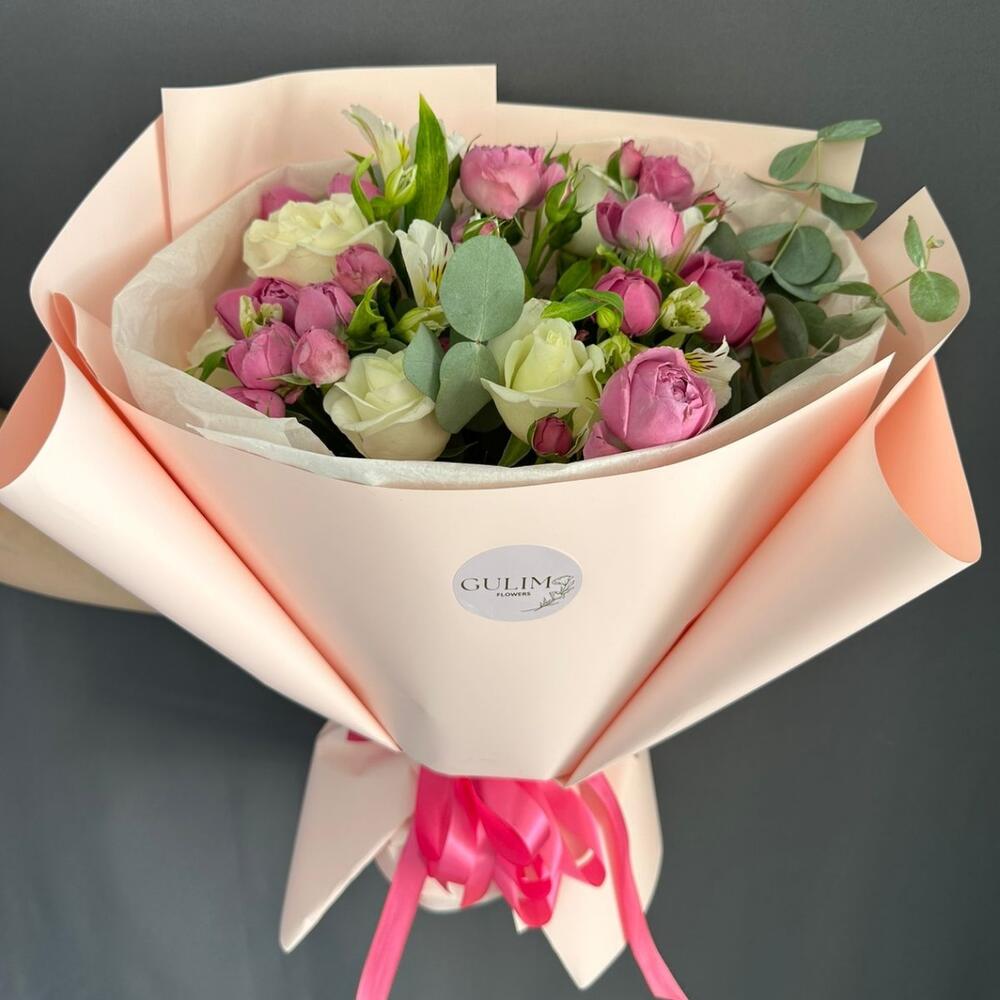 Альстромерии, Гвоздики, Кустовые розы, Лизиантусы, Розы, Хризантемы