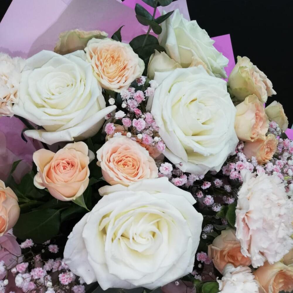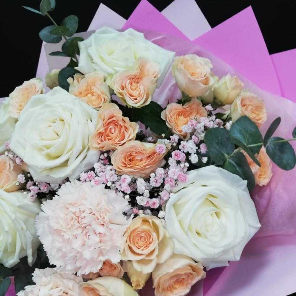 Роза кустовая – 5 шт. Эвкалипт – 3 шт. Лента атласная – 4 шт. Диантус – 3 шт. Слюда упаковка – 3 шт. салфетка декоративная – 5 шт. гипсофила радужная – 2 шт. роза плей бланка – 5 шт.