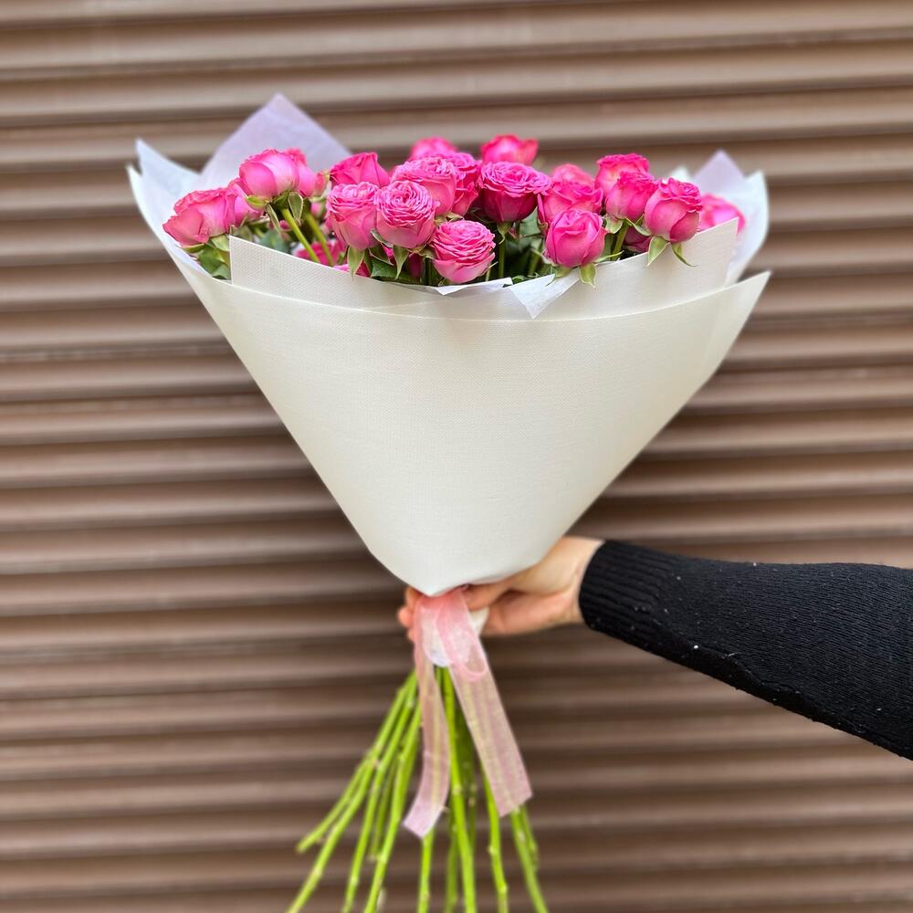 Лента атласная – 1 шт.Пленка матовая – 2 шт.Пионовидная роза кустовая – 15 шт.