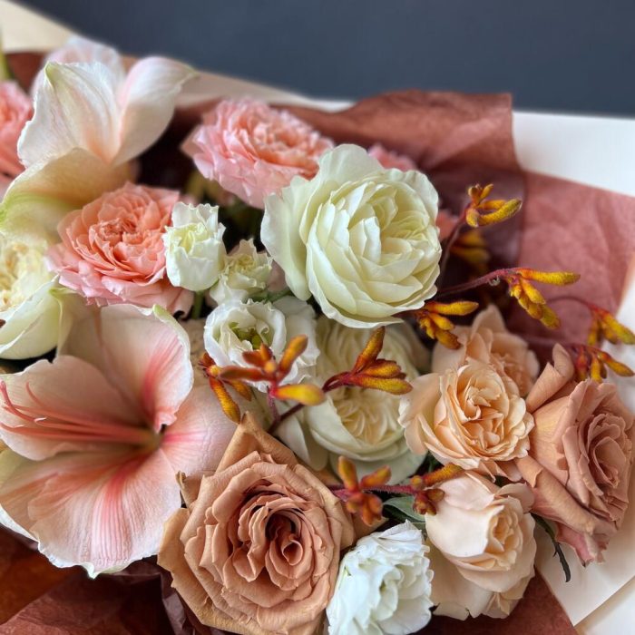 Амариллис – 1 шт.Кустовая роза – 4 шт.Пионовидная роза – 6 шт.Анигозантус – 3 шт.Ирис – 3 шт.Лизиантус – 2 шт.декоративная упаковка – 1 шт.Атласная лента – 1 шт.