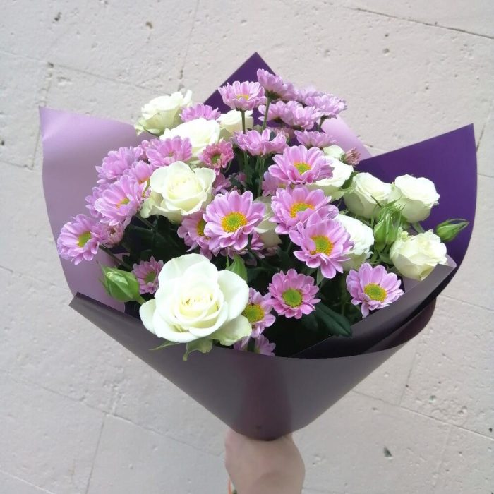 Лента – 1 шт.Роза кустовая – 3 шт.Хризантема Сантини – 4 шт.Упаковка – 1 шт.
