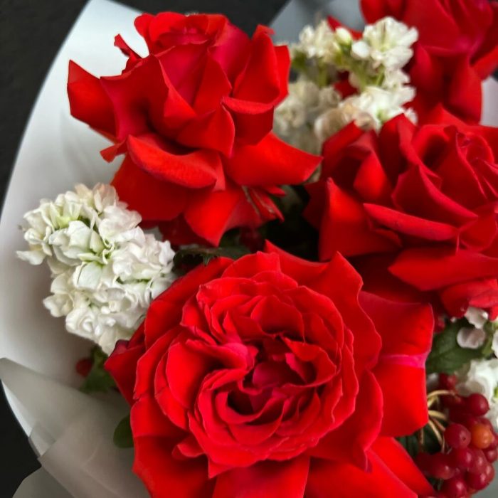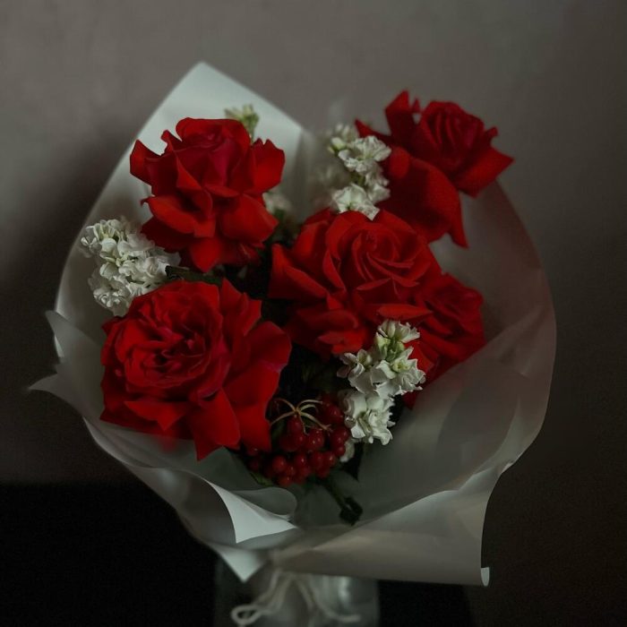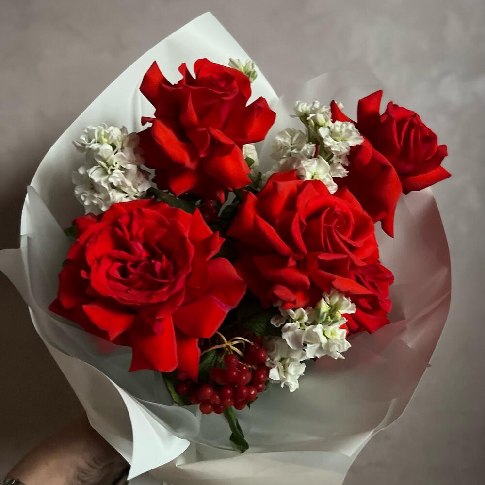 Роза – 5 шт.Маттиола – 5 шт.Вибурнум – 1 шт.декоративная упаковка – 1 шт.Атласная лента – 1 шт.