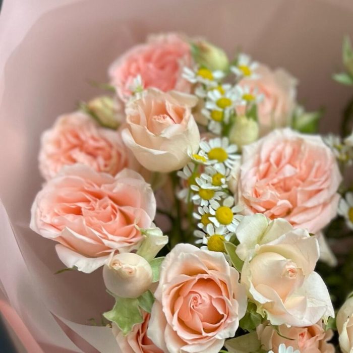 Кустовая роза – 5 шт.Танацетум – 4 шт.декоративная упаковка – 1 шт.Атласная лента – 1 шт.