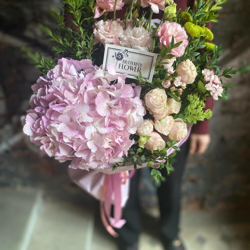 Букет из лизиантуса, гортензии, кустовой розы, эвкалипта и сезонных цветов “Маноло”