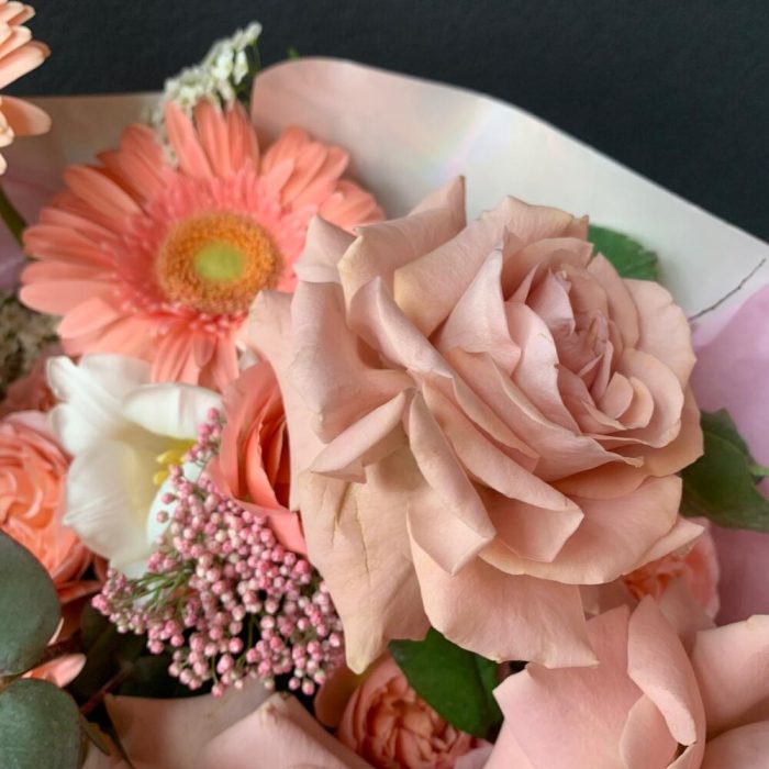 Пионовидная роза – 6 шт.Гербера – 3 шт.Тюльпан – 3 шт.Кустовая роза – 2 шт.Озотамнус – 1 шт.Эвкалипт – 3 шт.декоративная упаковка – 1 шт.Атласная лента – 1 шт.
