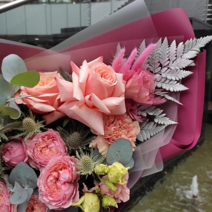 кахала роза – 2 шт.маттиола персиковая – 2 шт.джульетта роза пионовидная – 1 шт.Диантус – 3 шт.Эрингиум – 1 шт.Папоротник – 1 шт.Лагурус (сухоцвет) – 3 шт.Упаковка дизайнерская – 1 шт.