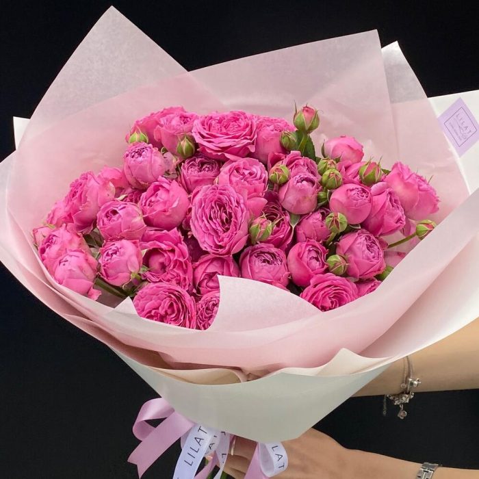 Misty Bubbles пионовидная роза – 9 шт. Упаковка дизайнерская – 2 шт. Открыточка с вашими пожеланиями – 1 шт. инструкция по уходу за цветами – 1 шт.
