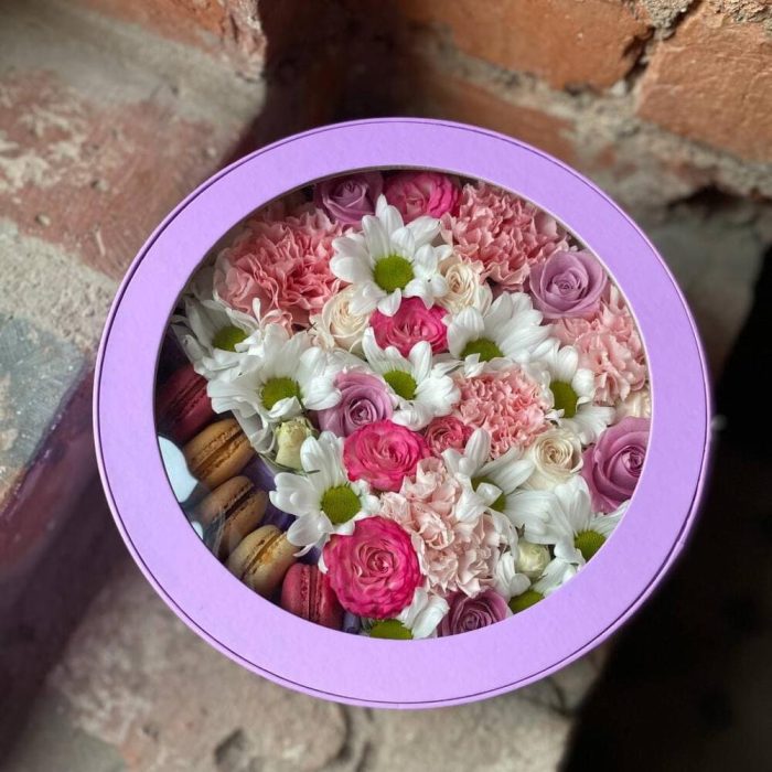 Макарон – 5 шт.Коробка – 1 шт.Хризантема кустовая – 2 шт.Диантус – 5 шт.Роза кустовая – 2 шт.Роза – 5 шт.