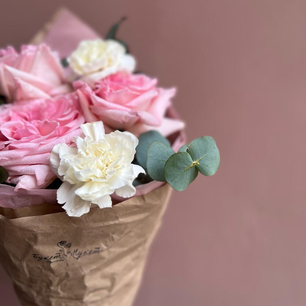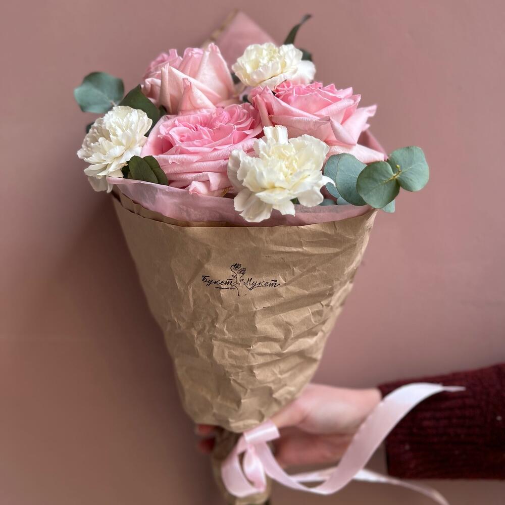 Эвкалипт – 1 шт.Лента атласная – 1 шт.Тишью – 1 шт.Диантус – 3 шт.Крафт – 1 шт.роза премиальная о’хара – 3 шт.