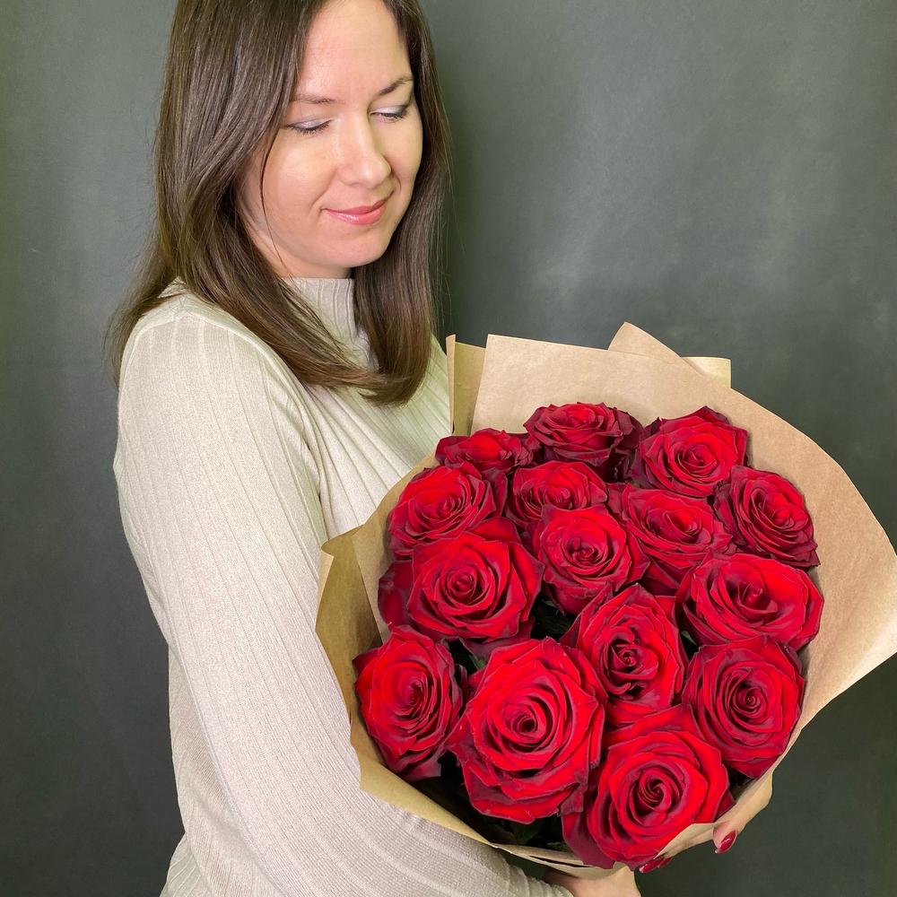 Роза Эквадор – 15 шт.Крафт упаковка – 3 шт.Лента атласная – 1 шт.