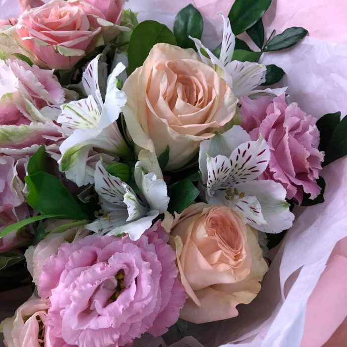 Альстромерия – 2 шт.Лизиантус – 4 шт.Оформление – 1 шт.Гортензия – 1 шт.роза кения – 2 шт.Роза кустовая – 2 шт.Рускус Италия – 3 шт.