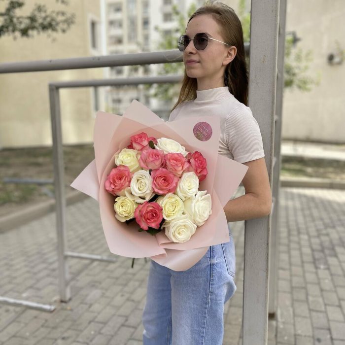 Упаковка – 1 шт. Атласная лента – 1 шт. белые и розовые розы – 15 шт.