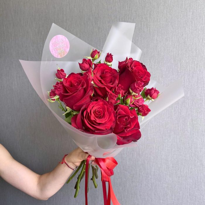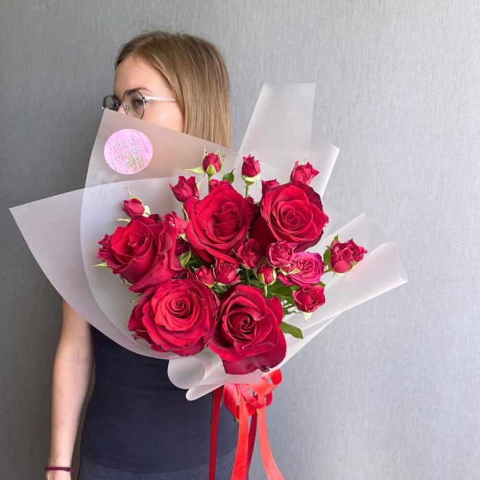 Роза одноголовая – 5 шт. Упаковка – 1 шт. Атласная лента – 1 шт. кустовая роза (ветки) – 2 шт.