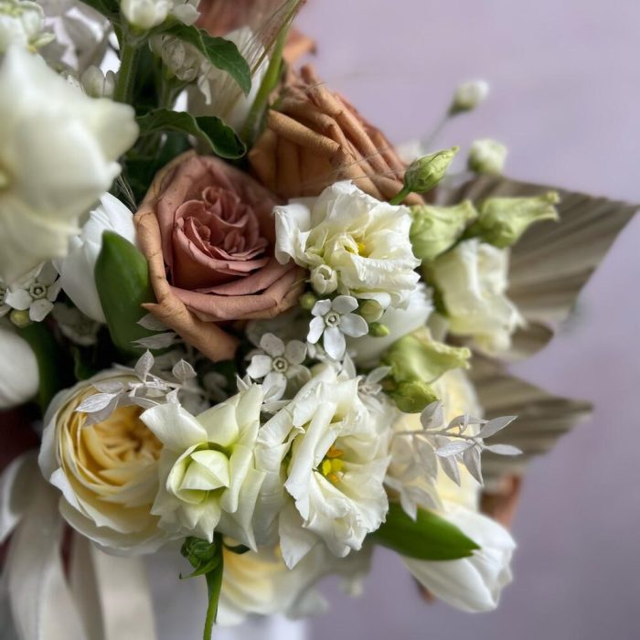 Лизиантус – 2 шт.Маттиола – 3 шт.Тюльпан – 5 шт.Пионовидная роза – 7 шт.Атласная лента – 2 шт.Оксипеталум – 5 шт.рускус сухоцвет – 2 шт.пальмовое копье – 2 шт.японский ранункулюс – 3 шт.
