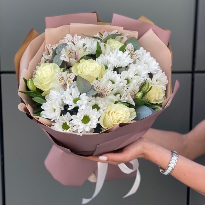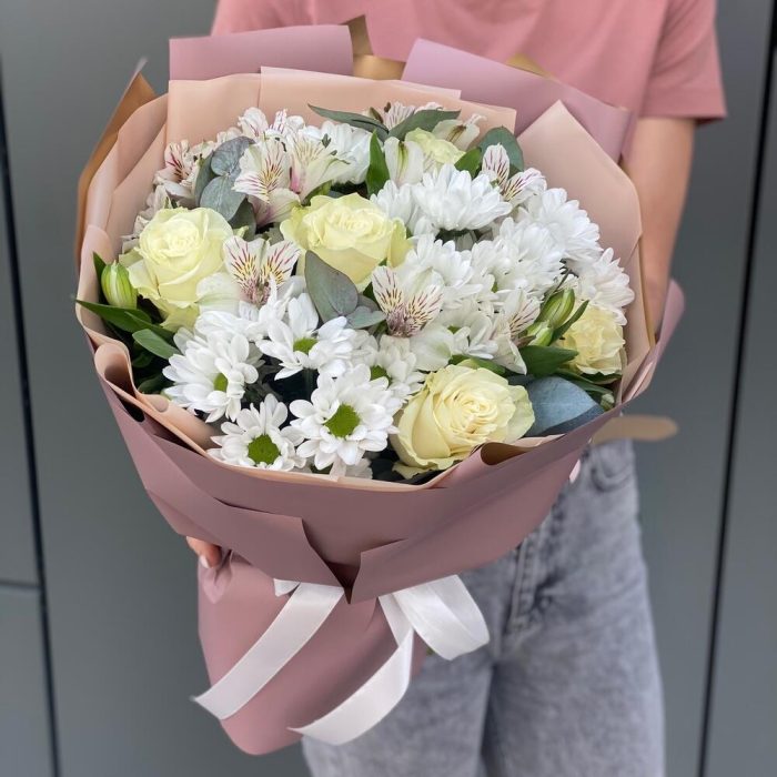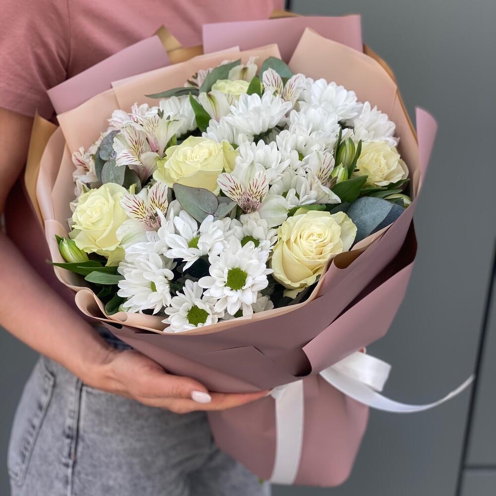 Эвкалипт – 2 шт. Хризантема – 4 шт. Роза белая мондиаль – 5 шт. Альстромерия – 6 шт. Оформление – 1 шт.