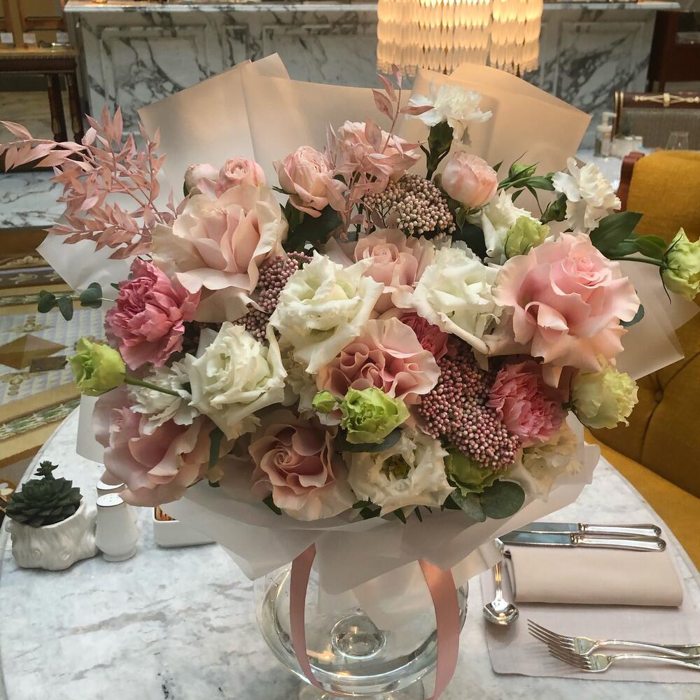 Роза пинк мондиаль – 7 шт.Лизиантус Алиса белый – 5 шт.Гвоздика сортовая – 7 шт.Озотамнус розовый – 3 шт.Сухоцветы – 2 шт.Эвкалипт Baby Blue – 5 шт.Упаковка дизайнерская – 4 шт.Лента – 3 шт.