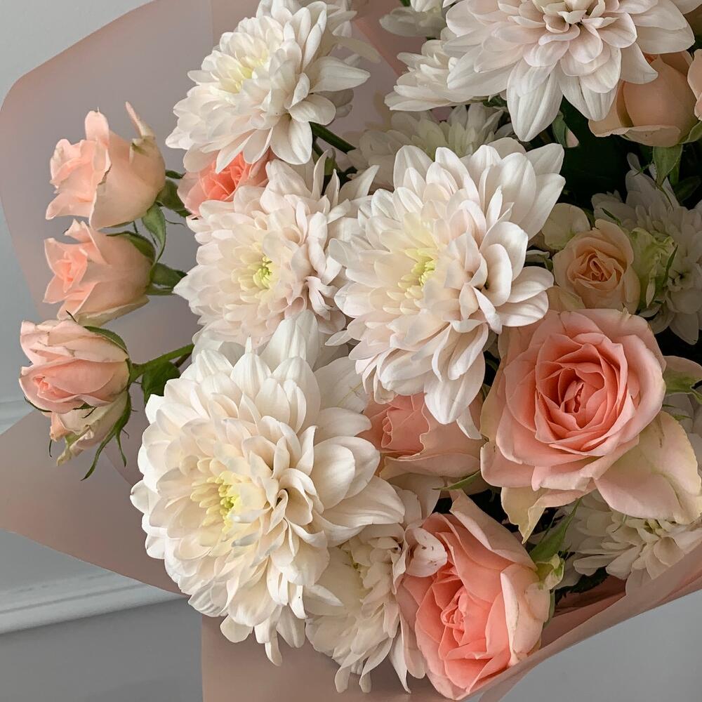 Хризантема кустовая – 4 шт.Роза кустовая – 7 шт.Матовая пленка – 1 шт.Лента – 1 шт.Кризал – 1 шт.