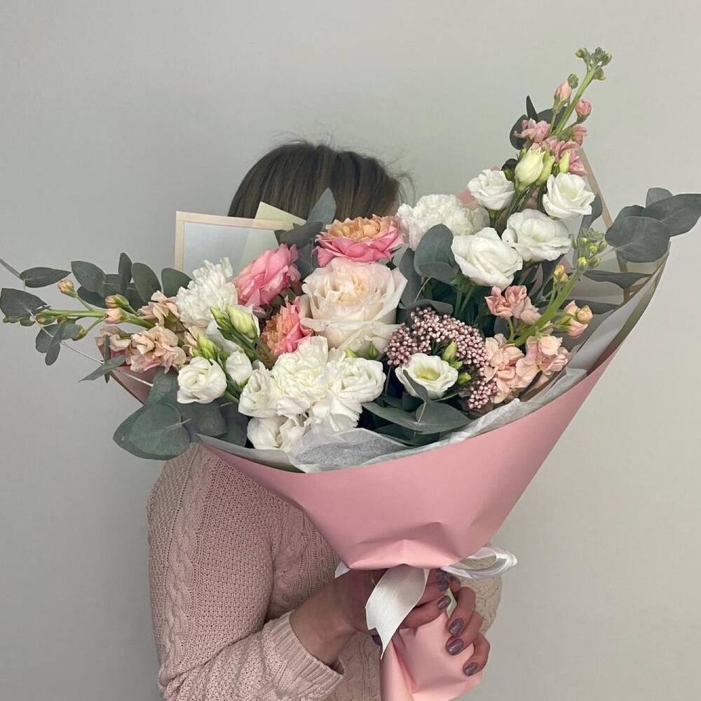 Роза Эквадор – 1 шт.Роза пионовидная кустовая – 1 шт.Диантус – 3 шт.Лизиантус – 2 шт.Озотамнус – 1 шт.Маттиола – 3 шт.Эвкалипт – 2 шт.Фисташка – 3 шт.Упаковка дизайнерская – 3 шт.