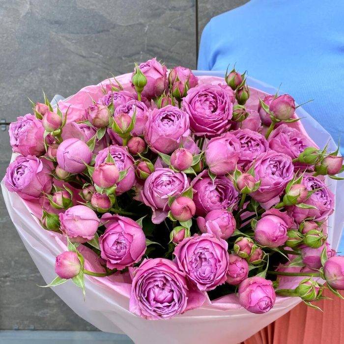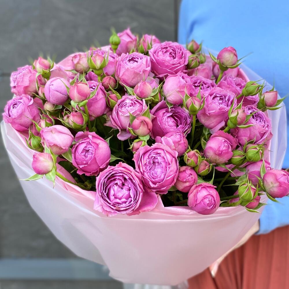 Лента атласная – 1 шт.Упаковка дизайнерская – 2 шт.роза кустовая пионовидная мисти бабл – 9 шт.