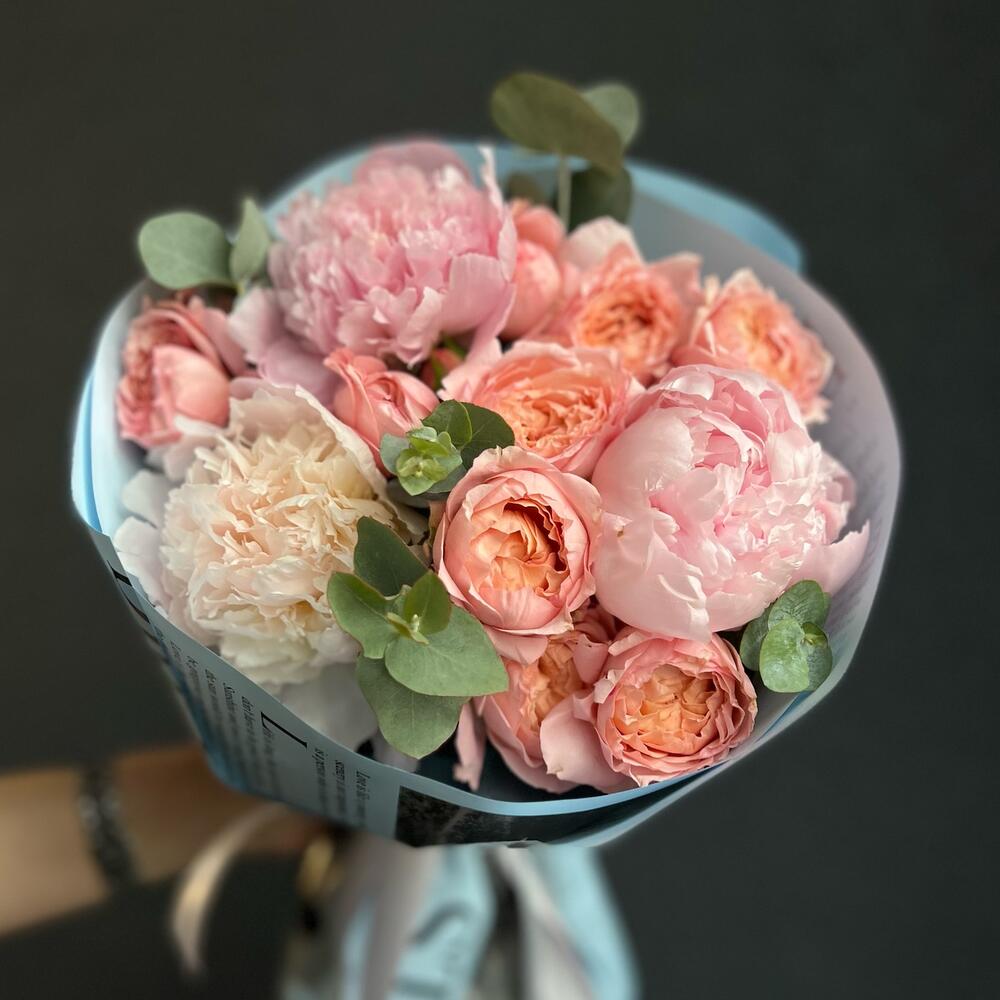Эвкалипт – 5 шт.Атласная лента – 1 шт.Кустовая пионовидная роза – 2 шт.декоративная упаковка – 1 шт.пионы – 3 шт.
