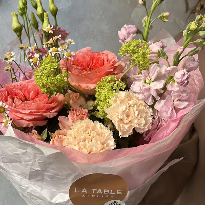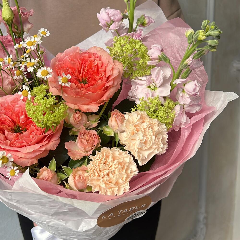 Матрикария (Ромашка Камила) – 1 шт.Роза пионовидная – 2 шт.Диантус – 2 шт.Роза кустовая пионовидная – 1 шт.Лизиантус – 1 шт.Маттиола – 2 шт.Упаковка дизайнерская – 1 шт.