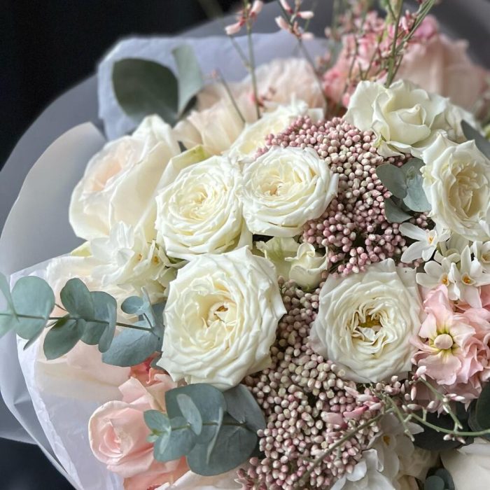 Пионовидная роза – 7 шт.Кустовая роза – 5 шт.Одноголовая роза – 3 шт.Гениста – 2 шт.Озотамнус – 2 шт.Маттиола – 3 шт.нарциссов – 5 шт.Эвкалипт – 5 шт.декоративная упаковка – 1 шт.Атласная лента – 1 шт.