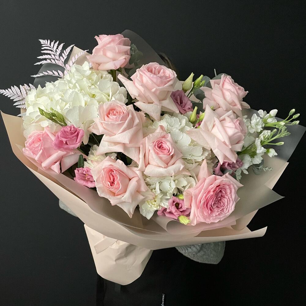 Букет с пионовидными розами и гортензиями