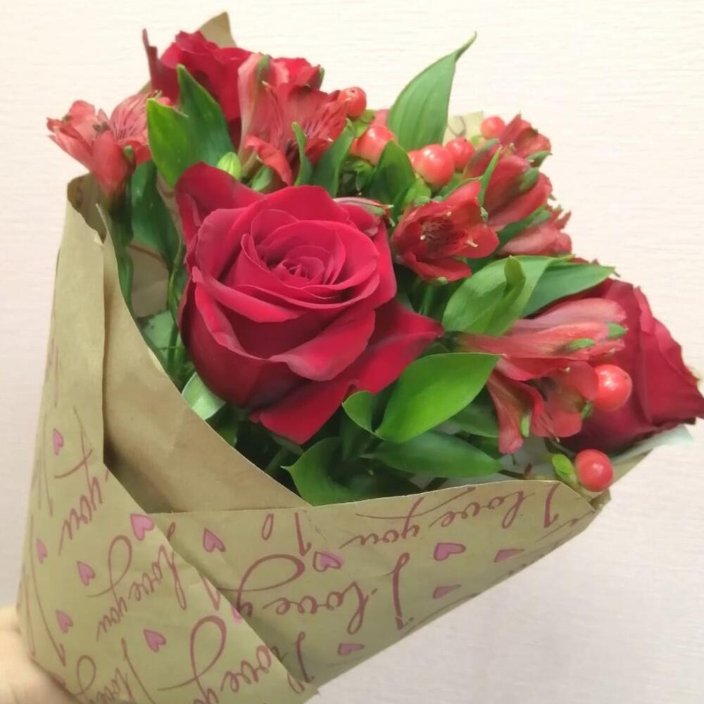 Альстромерия – 3 шт.Гиперикум – 3 шт.Лента – 1 шт.Рускус – 2 шт.Роза – 3 шт.Упаковка – 1 шт.