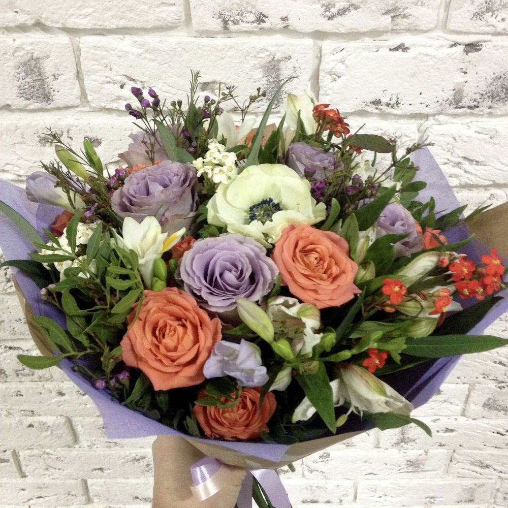 Анемон белый – 1 шт.Роза грей кнайт – 5 шт.Альстромерия Микс Европа – 3 шт.Фрезия ( микс ) – 3 шт.Роза Эквадор – 3 шт.