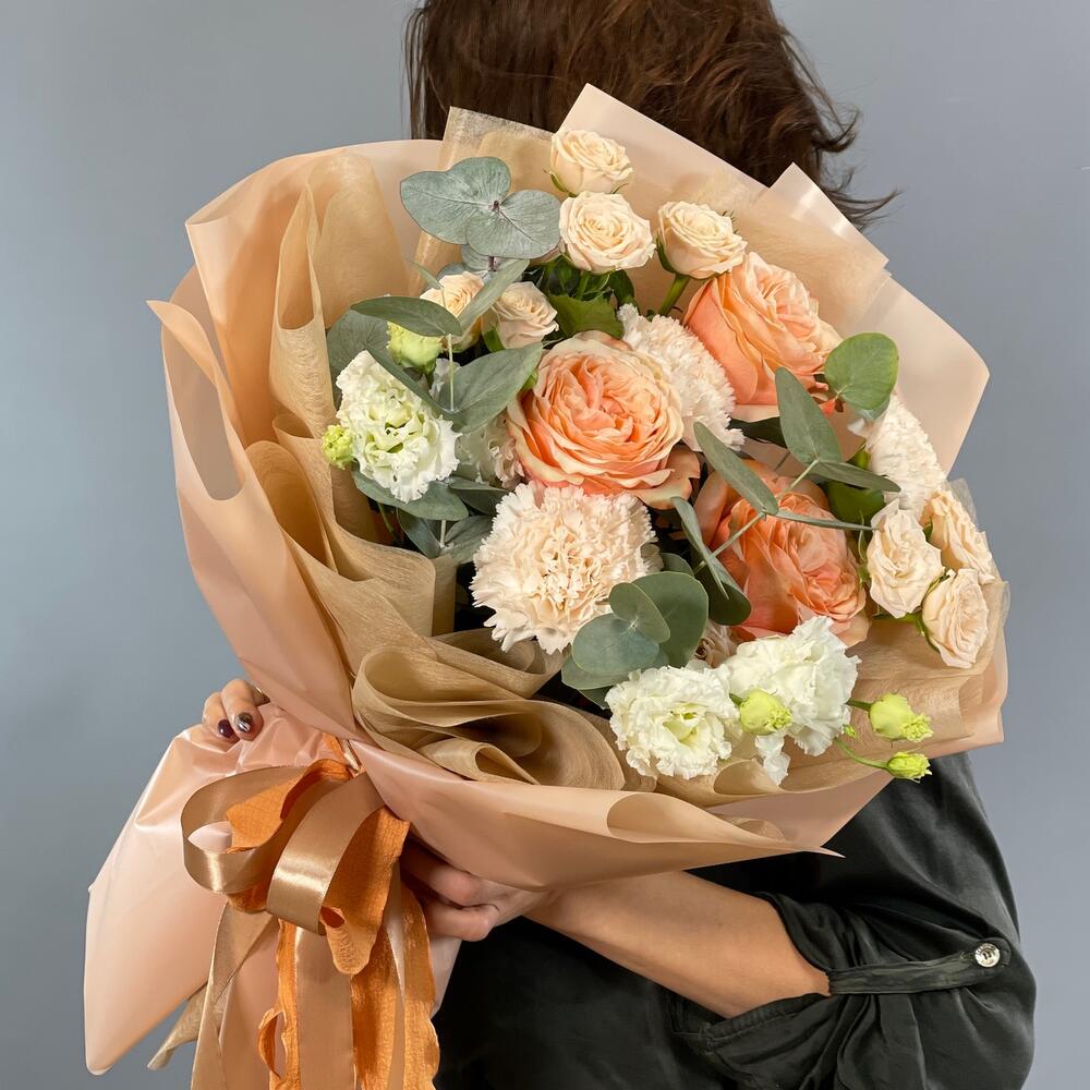 Букет с розами и лизиантусами “Персиковый джем”