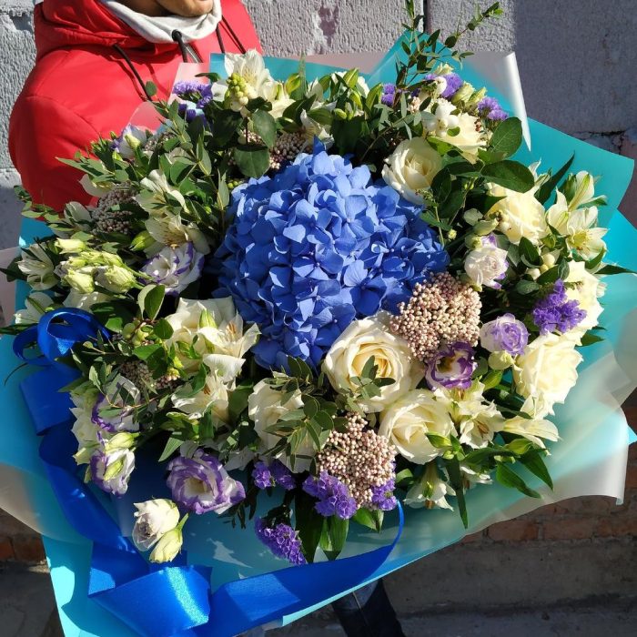 Гортензия синяя – 1 шт.Озотамнус – 7 шт.Роза – 15 шт.Статица – 5 шт.Лизиантус – 7 шт.Альстромерия – 7 шт.Эвкалипт – 3 шт.Зелень – 1 шт.Упаковка дизайнерская – 1 шт.Лента атласная – 1 шт.