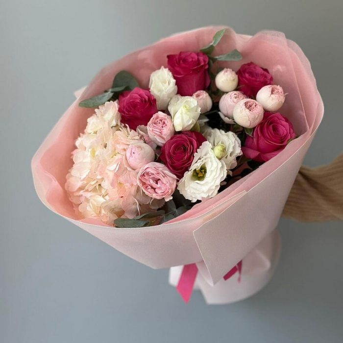 “Эвкалиптическая роскошь” гортензия и пионовидная кустовая роза