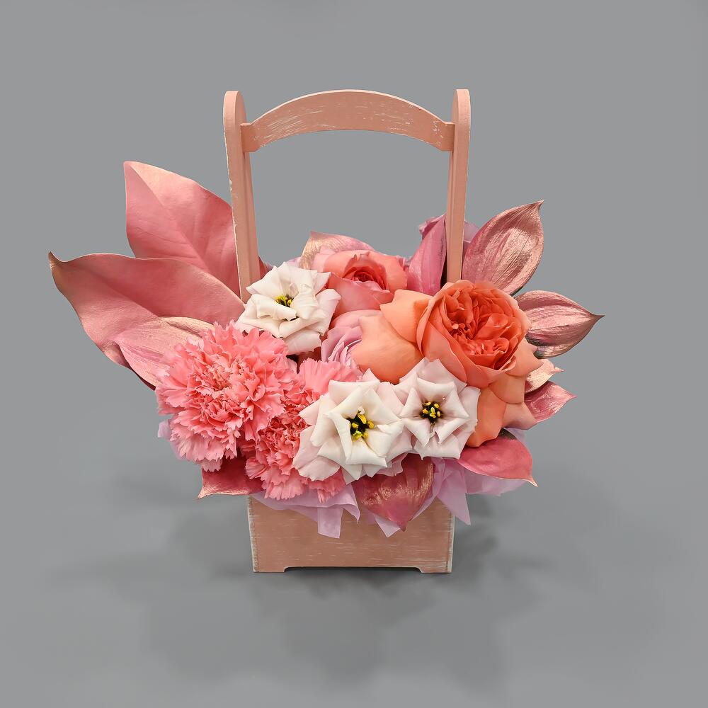 Французская роза – 3 шт.Лист магнолии – 2 шт.Гвоздика – 3 шт.Рускус – 4 шт.Эустома – 1 шт.Кустовая пионовидная роза – 2 шт.Ящик деревянный – 1 шт.Тишью – 1 шт.