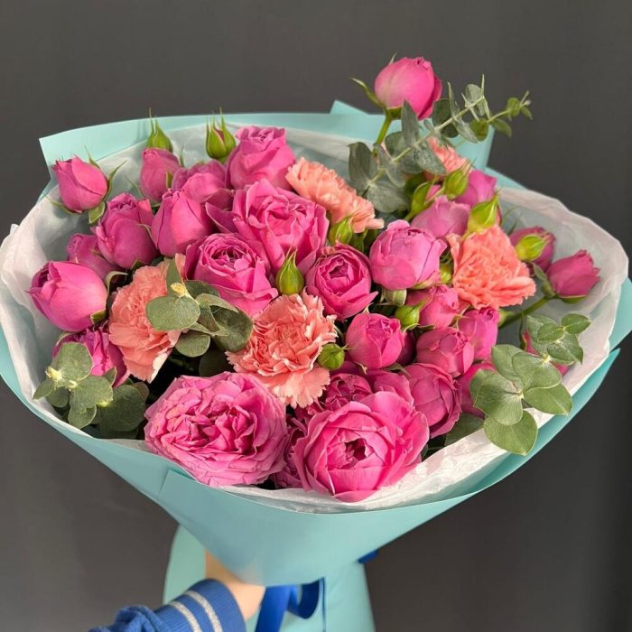 Альстромерии, Гвоздики, Кустовые розы, Лизиантусы, Розы, Хризантемы