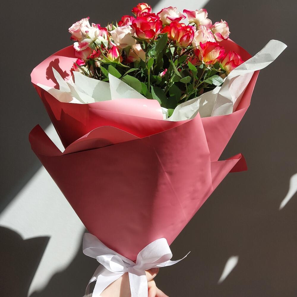 Роза кустовая – 5 шт.Лента атласная – 1 шт.Тишью – 2 шт.Авторская упаковка – 1 шт.