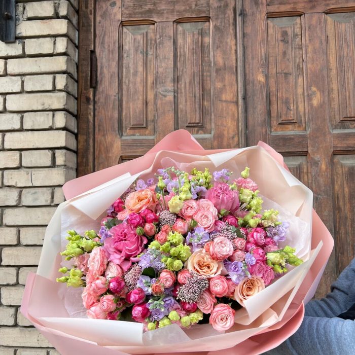 Гвоздики, Лизиантусы, Розы, Тюльпаны