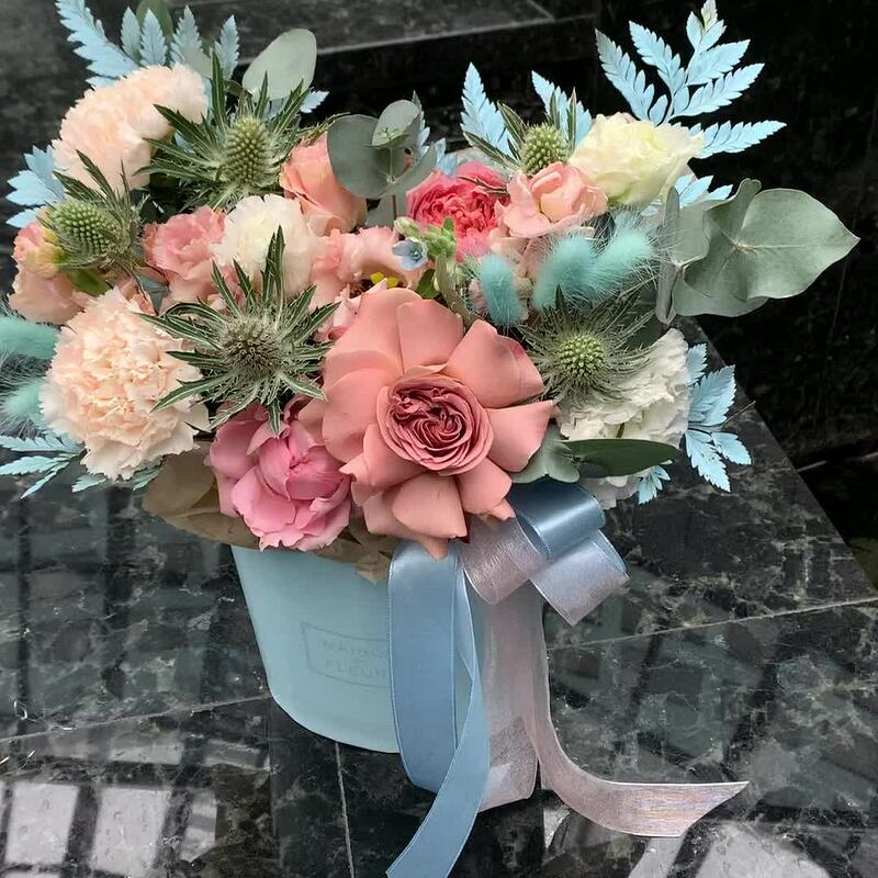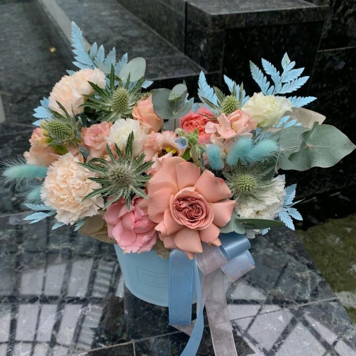 Капучино – 1 шт.диантус брют – 2 шт.Маттиола – 1 шт.Лизиантус – 1 шт.Эрингиум – 1 шт.джульетта роза пионовидная – 1 шт.Папоротник – 1 шт.