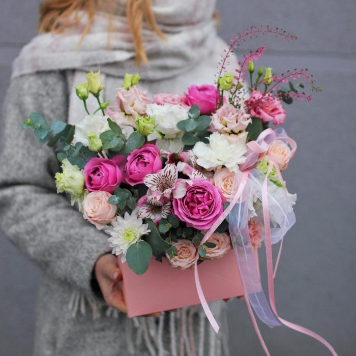 Нежная цветочная композиция в крафтовом конверте. Цветы расположены во влажной флористической губке и не требуют вазы с водой.