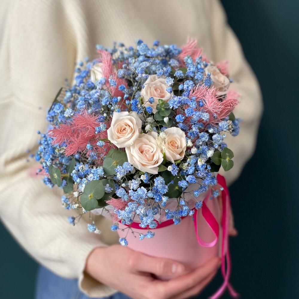 Цветочная композиция в шляпной коробке с голубой гипсофилой “Майолика”