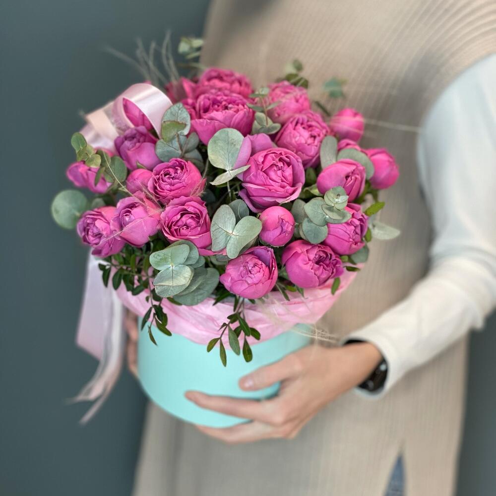 Цветочная композиция в шляпной коробке с пионовидными розами"Мисти"