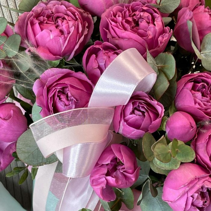 Лента – 1 шт.Эвкалипт – 2 шт.Тишью – 1 шт.Коробка шляпная – 1 шт.Фисташка – 2 шт.Роза кустовая пионовидная – 7 шт.Ковыль – 3 шт.Оазис флористический – 1 шт.