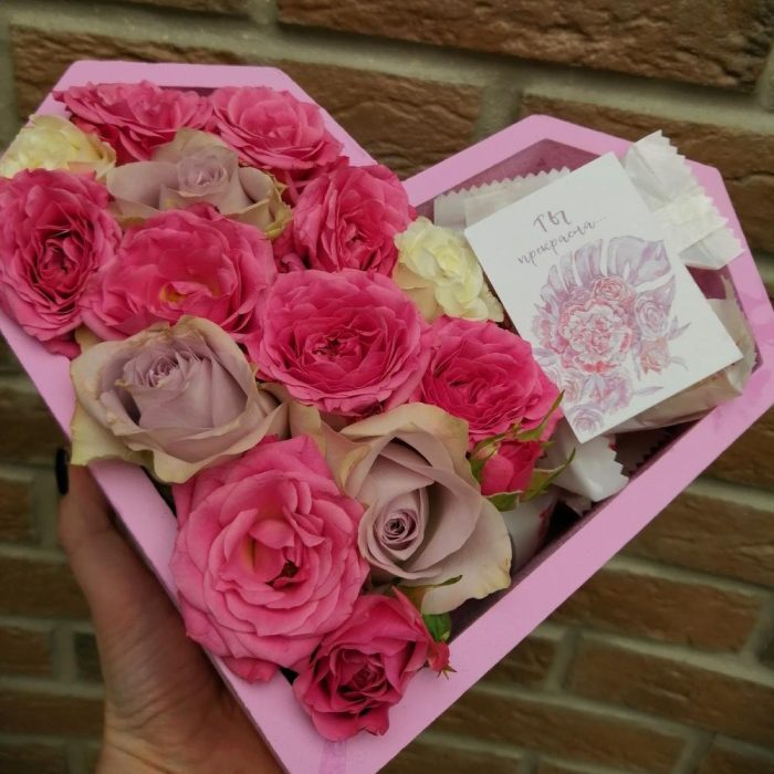 Коробка сердце – 1 шт.Флористическая губка – 1 шт.Роза одноголовая – 3 шт.Роза кустовая – 5 шт.Эвкалипт – 1 шт.Карточка для подписи – 1 шт.рафаело конфеты – 15 шт.