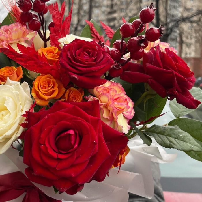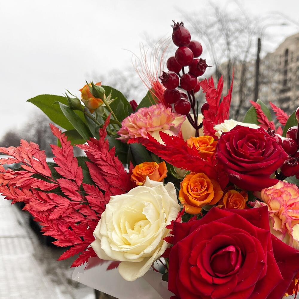 Гвоздика сортовая – 3 шт.Роза Россия 50 см – 9 шт.Ягоды декоративные – 2 шт.Оазис флористический – 1 шт.Салал пучок – 1 шт.Кустовая роза оранжевая 50 см – 2 шт.папоротник ветка – 2 шт.коробка маленькая – 1 шт.колосок полевой – 1 шт.